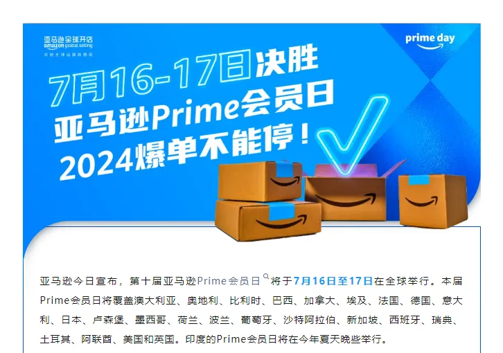 亚马逊官方公众号发布消息,亚马逊2024年Prime会员日定档,将于7月16日-17日进行!
