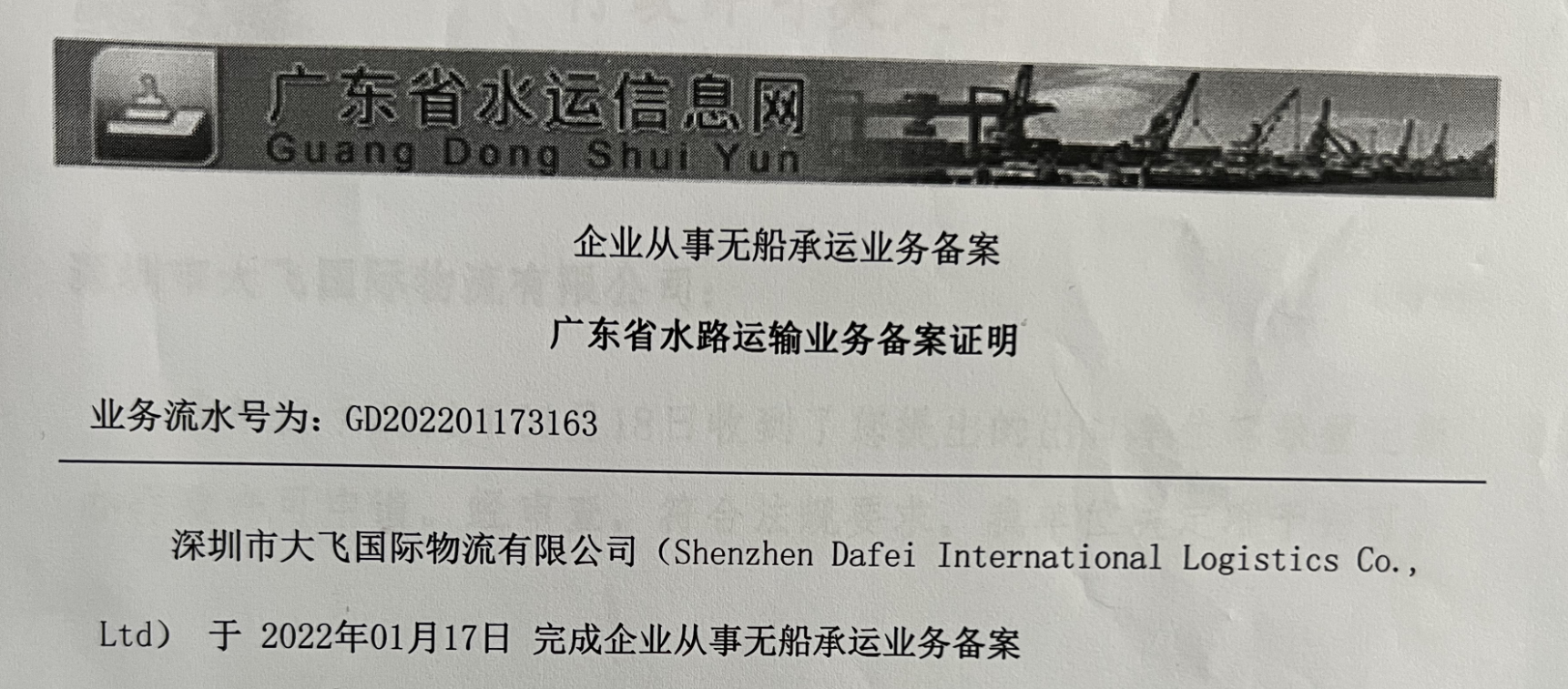 深圳市大飞国际物流有限公司成立于2021-12-07,企业地址位于深圳市宝安区福海街道新和社区宝安大道6095-1号-15,所属行业为多式联运和运输代理业,经营范围包含:一般经营项目是:信息咨询服务(不含许可类信息咨询服务);装卸搬运;运输代理(不含航空客货运代理服务和水路运输代理);工业互联网数据服务;供应链管理服务;软件开发;国内集装箱货物运输代理;国内贸易代理;国内货物运输代理。(除依法须经批准的项目外,凭营业执照依法自主开展经营活动),许可经营项目是:普通货物仓储服务(不含危险化学品等需许可审批的项目);航空国际货物运输代理;陆路国际货物运输代理;海上国际货物运输代理;报关业务;报检业务;无船承运业务;从事国际集装箱船、普通货船运输;进出口代理;城市配送运输服务(不含危险货物);道路货物运输(不含危险货物);水路普通货物运输。(依法须经批准的项目,经相关部门批准后方可开展经营活动,具体经营项目以相关部门批准文件或许可证件为准)。