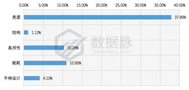 亮度(ULTRA BRIGHT)、结构(DEPENDABLE BUILD)、易用性(DESIGNED FOR CONVENIENCE)、能耗(LOW CONSUMPTION)以及独特的手柄设计(FOLDAWAY HANDLES)是商品页面中罗列的五条重要商品卖点(Bullet Points)。根据词汇匹配与词频统计,骆探长发现,在所有的商品评论中,共有1017条评论谈及了产品的亮度特质,占比37.89%;有276条评论讲到了产品使用的便易程度,占比10.28%;有110条评论说起了产品的折叠式手柄设计,占比4.10%;有294条评论提到了产品在能耗方面的相关性能,占比10.95%;此外,仅有30条评论具体地说到了产品牢固的结构设计,占比1.12%。可见,在五个重要商品卖点中,亮度特质是买家最为关注的焦点,产品的能耗与易用性同样颇受消费者关注。