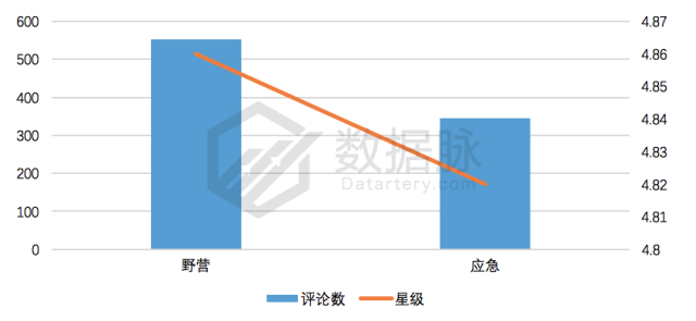 野营照明与突发应急是户外照明工具的两大使用场景。经骆探长调查发现,在所有的评论中,有553条评论直接提到了产品在户外野营中的使用,同时有346条评论谈及了产品在突发应急(特别是电力中断)场景下的作用。其中,在反映户外野营话题的评论中,褒义词汇“great”出现136次、“perfect”出现52次、“good”出现31次,评论平均星级4.86;而在反映突发应急话题的中,褒义词汇“great”出现75次、“perfect”出现36次、“good”出现11次,评论平均星级4.82。可以说,作为一款户外照明工具,这款户外 LED 野营灯很好地解决了买家在野营与应急两方面的需求,其中在野营使用方面更为出色。