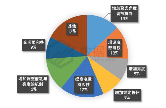 根据句式匹配,骆探长从评论中一共找出了23为对产品发出了直接诉求的买家。在他们之中,增加野营灯产品的电量持久性(占比17%)、增设便于固定的底部磁铁(占比13%)、增加调整能耗与亮度的机制(占比13%)以及增加聚光角度调节机制(占比13%)成为了买家们对产品较为突出的集中诉求。