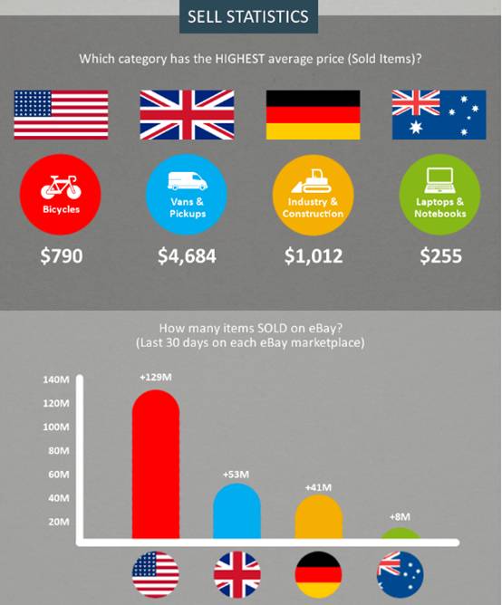 据报告显示,美国站售出的产品中,自行车的平均单价较高,达790美元;英国站是卡车,平均价格达4684美元;德国站是工业及建筑产品,平均价格达1012美元;澳洲站是笔记本电脑,平均价格达255美元。