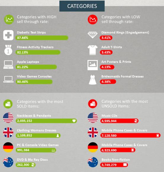 eBay美国站未售出量最高的品类是音乐CD,达4595944;英国站和德国站都是手机壳,分别达7128580件和4323690件;澳洲站是非小说类书籍,未售出量达3749279件。