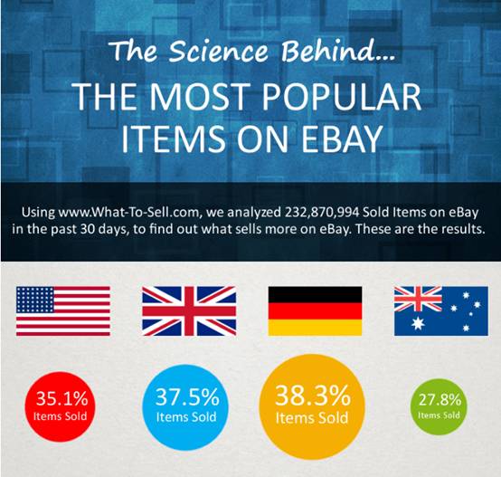 过去一个月来,eBay售出了232870994件产品,其中美国站产品售出率达35.1%、英国站是37.5%、德国站是38.3%、澳洲站是27.8%。