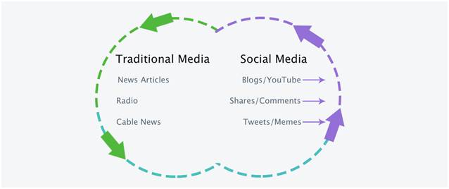 从社媒上的评论、分享、发布博客、到在Youtube上发布恶搞视频,所有的这些都被加入到了一个新闻事件的传播周期当中。老牌新闻机构引用社媒消息、互联网争论不断升级,一个新闻事件的传播达到了前所未有的速度。