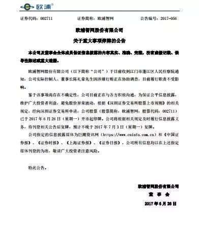 欧浦智网称,公司实际控制人、董事长陈礼豪目前履行职责不受影响,公司将根据相关规定及时履行信息披露义务,待刊登相关公告后复牌,预计不晚于2017年7月3日复牌。