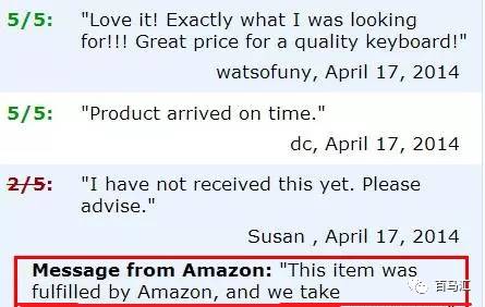 4.由FBA引起的物流问题,亚马逊不会帮你将差评移除,但是会帮你划掉差评,然写一行字: This item was fulfilled by Amazon, and we take responsibility for this fulfillment experience.