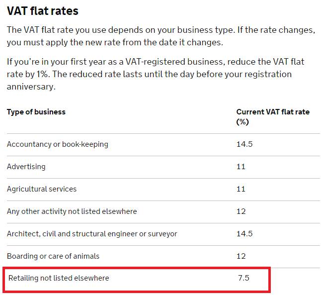 如果你第一年的销售额没有超过23W GBP,那么你可以使用这个6.5%的优惠(缺点是:你不能退税,只能缴纳固定6.5%,但是这样还是比缴纳20%划算的)。
