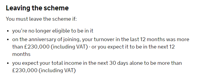这里的15W 是不含税(excluding VAT)的销售额,如果加上20%的VAT销售税,15*(1+20%)= 18 那么就是18W GBP,也就是说当你一年卖到18W GBP的时候,你要开始考虑离开这个Flat模式,但是并不是要你马上离开,而是有缓冲的时间,你可以一直考虑直到销售达到23W GBP。 当你销售达到23W GBP,那么你一定要离开。