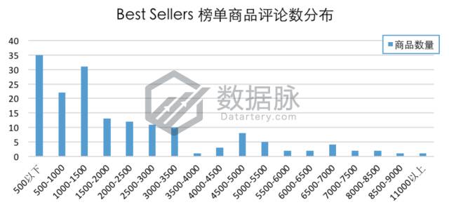 在上周登榜Clothing, Shoes & Jewelry品类Best Sellers榜单的商品中,单个商品拥有的最大评论数为13219,最小评论数为1条,平均评论数2570.1条,评论平均星级4.26星。上周Best Sellers榜单商品的平均评论数继续回升,除了依旧有21.21%的商品评论数在500条以下之外,评论数在1000条至1500条的商品占比略有增加, 达18.79%。此外,Converse 的一双经典板鞋上周成功上榜,成为唯一一款评论数破万的上榜商品。