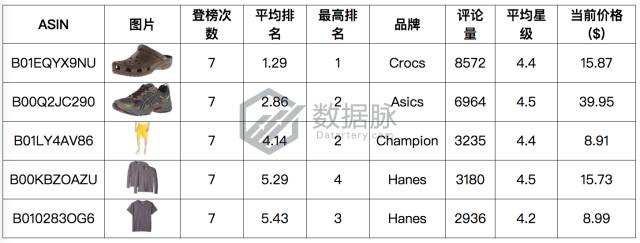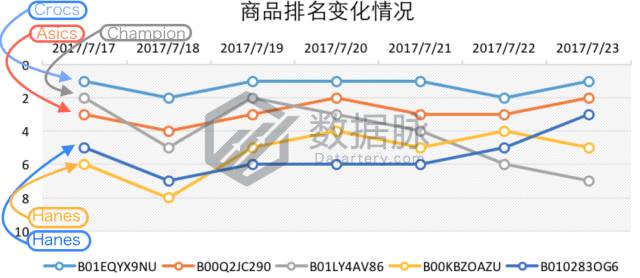 可以看到,在上周Clothing, Shoes & Jewelry品类的Best Seller榜单中,Crocs洞洞鞋依旧保持稳定发挥,一周内5次登顶Best Sellers榜首,以平均排名1.29的成绩继续在这个炎热的夏季领跑榜单;