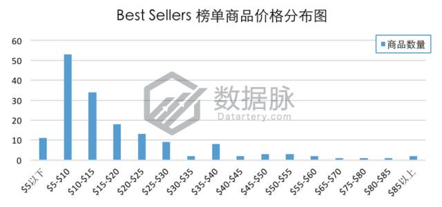 上周Clothing, Shoes & Jewelry品类Best Sellers榜单商品最高价$89.95,最低价$0.99,平均价格$18.51。骆探长(shujumai.com)发现,上周上榜商品均价持续回升,同时价格分布 在$5.00-$10.00区间内的上榜商品数量也继续上升,占比达32.12%,另有20.61%的商品定价在$10.00-$15.00区间。此外,仅有 2款商品价格在$85.00以上,占比1.21%。