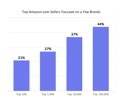 我们先来分析一组调查数据。在亚马逊排名前100的卖家中仅有21家销售他们的自有品牌,排名前1000的卖家中有27%,前10,000名的卖家中有37%,前100,000名的卖家中有44%销售3个品牌甚至更少。而非常顶级的卖家之所以成为the very top sellers,主要是其拥有并支撑多个品牌。排名越靠后,拥有少数品牌的卖家数量越多。在排名前100,000的卖家中,拥有较少品牌的卖家差不多占一半,无疑这展现出小卖家对品牌的关注程度。