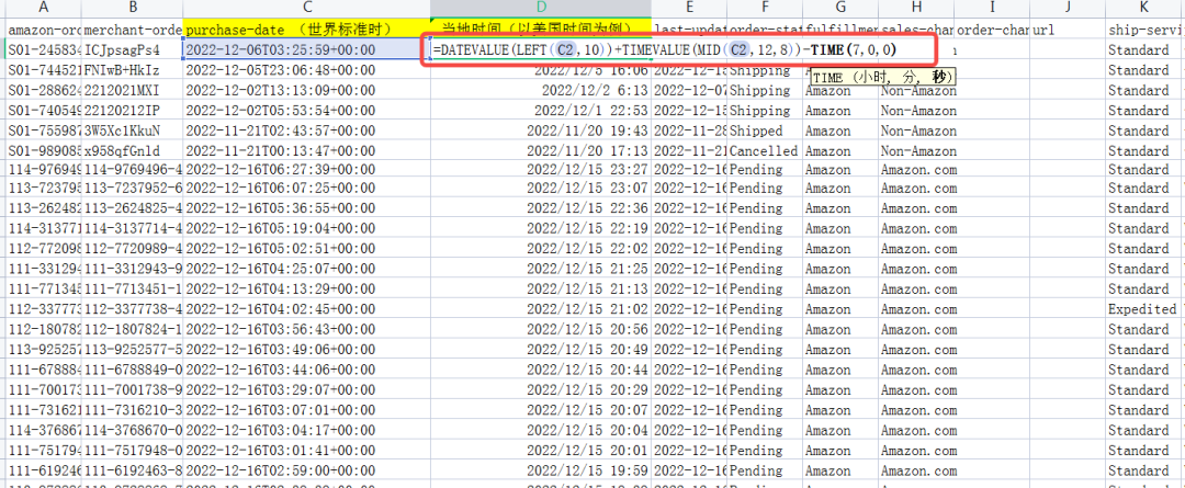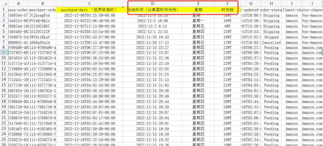 第2步,打开后我们看到C列是 purachase-date (这就是世界标准时),我们在其右侧新插入一列,命名为“当地时间”,在这一列把时间转换成当地时间分析出来就是准确的数据了。
