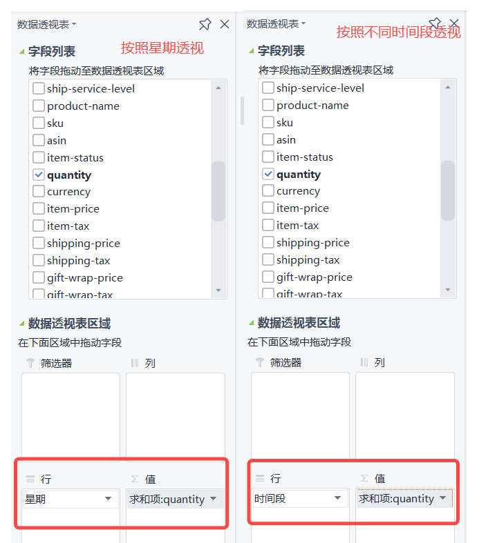 如下图所示,先按照星期(星期一-星期日)透视,行标签选择“星期”,值标签选择“求和项:quantiy”