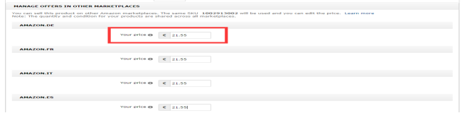 (2)点开产品Listing编辑页面,在offer下面manage offers in other marketplaces菜单,写上对应目标站点的价格,那么就会自动的将该站点的的产品以同样的sku和upc自动翻译上架到其他站点。