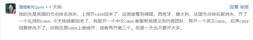 网友酒馆南风Qumi:我的先是英国的节点排名消失,上周开case回来了,这周接着到德国,西班牙,意大利,法国节点排名都消失,开了一个礼拜的case, 今天陆续都回来了,我是开一个中文case,客服帮我提交到内部团队,再开一个英文case。 如果case回复修改不了,你就在原case上继续开,或者再开第三个。但是一天也不要开太多。