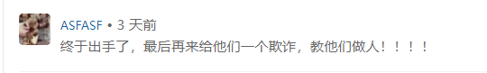 对此,网友ASFASF表示“终于出手了,最后再来给他们一个欺诈,教他们做人!!!!”。