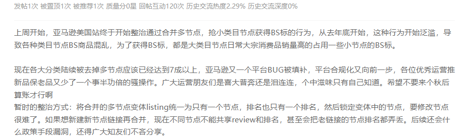 匿名网友发帖称“上周开始,亚马逊美国站终于开始整治通过合并多节点,抢小类目节点获得BS标的行为,从去年底开始,这种行为开始泛滥,导致各种类目节点BS商品混乱,为了获得BS标,都是大类目节点日常大宗消费品销量高的占用一些小节点的BS标。