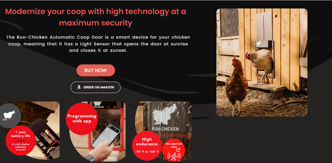 Run-Chicken是一款智能自动鸡舍门,安装简单,插电即用,使用非常方便,还可以设置自动打开和关闭,让养鸡更轻松高效。
