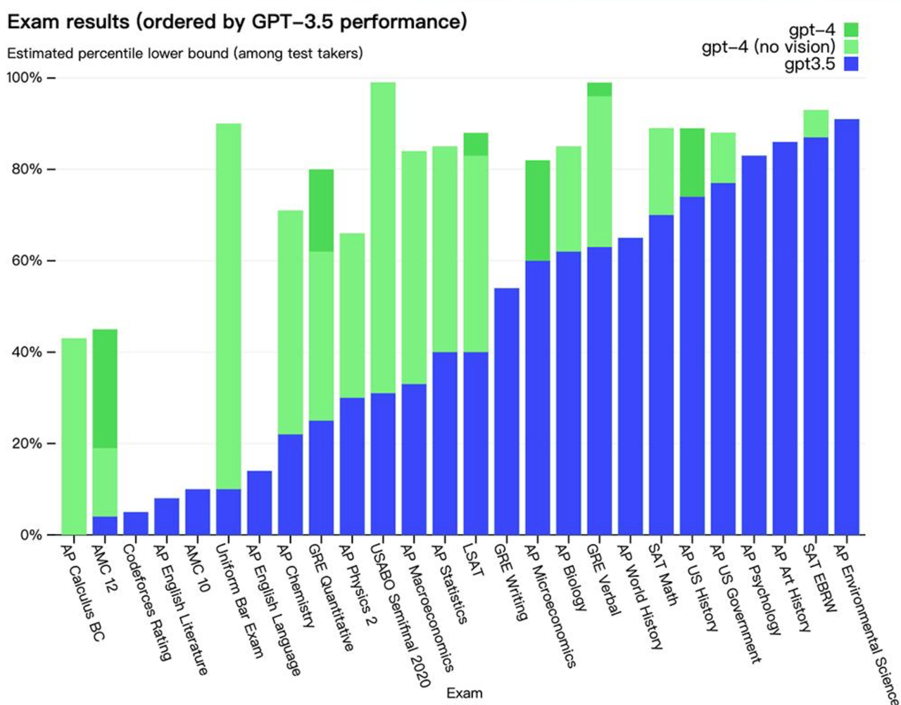 GPT-4因硬核的应试能力成为讨论的焦点,它在专业考试中成绩令人惊喜(如下图)。例如在模拟美国BAR律考中,GPT-4能挤进总排名前10%;在生物奥林匹克竞赛中,GPT-4以99%的水平分位获第一名。据OpenAI估计,目前,GPT-4能轻松通过USBAR律师考试。
