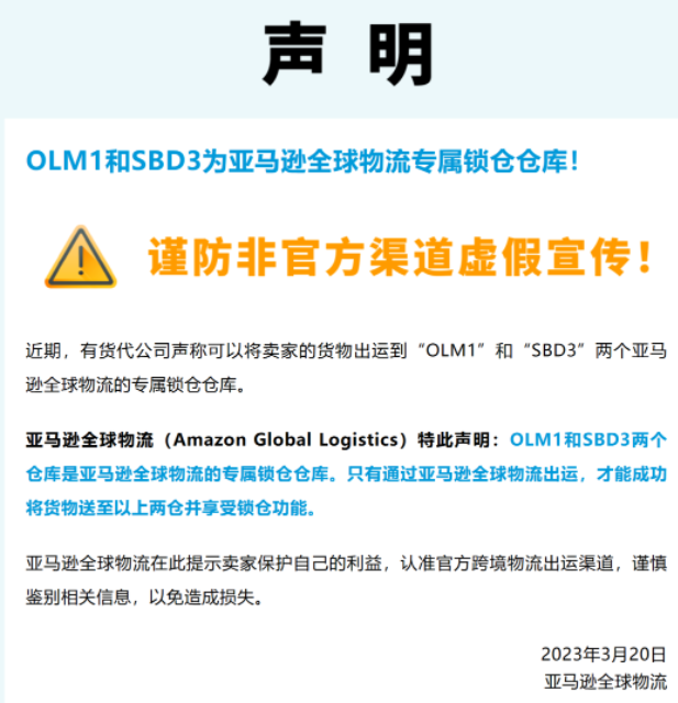 亚马逊官方物流AGL近期发布公告,称OLM1和SBD3两个仓库是AGL的专属仓库,只有使用AGL相关运输服务,才能成功将货物送至这两个仓库并享受锁仓功能。