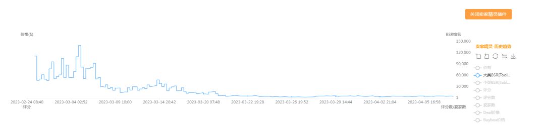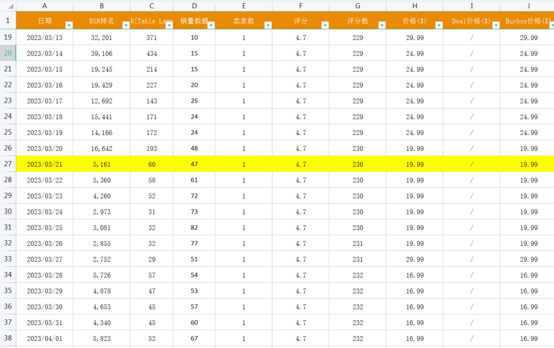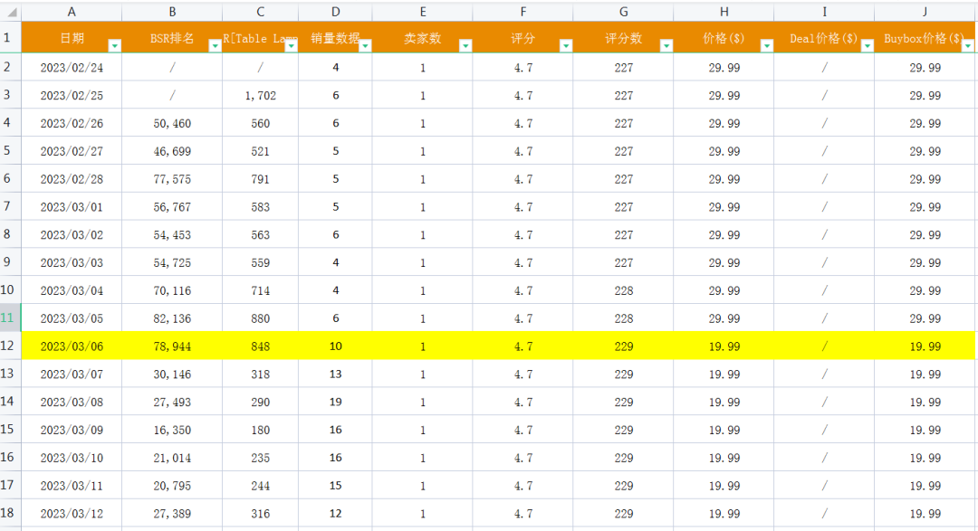 我用卖家精灵插件将其从上架到目前的数据大小类目排名、销量数据(销量我用H10预测,然后对应手工填写)、评论和评分变化、价格变化、购物车价格、Deal 价格等。
