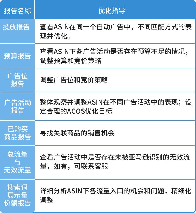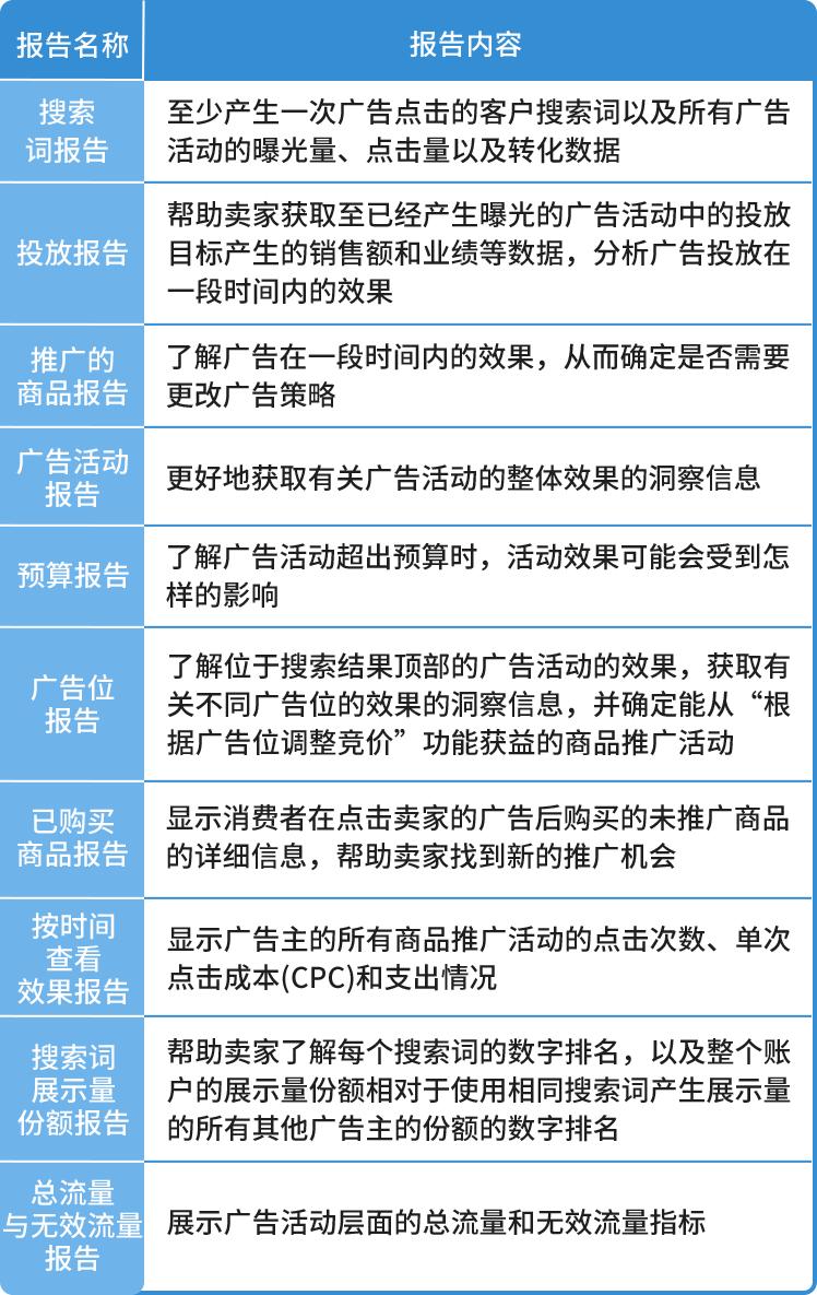 亚马逊商品推广广告包含:搜索词报告、投放报告、推广的商品报告、广告活动报告、预算报告、广告位报告、已购买商品报告、按时间查看效果报告、搜索词展示量份额报告、总流量与无效流量报告10大报告。