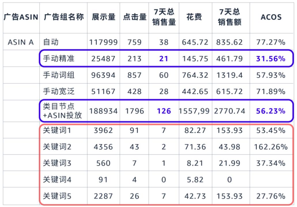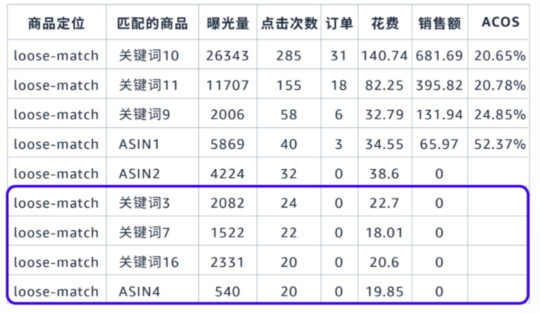 总之,当自动广告某一种匹配方式的ACOS较高时,我们可先分析在该匹配方式下,是否存在部分关键词占了较多的无效广告花费。直接“一刀切”来降低整个匹配方式的竞价,并不是最理想的优化方式。