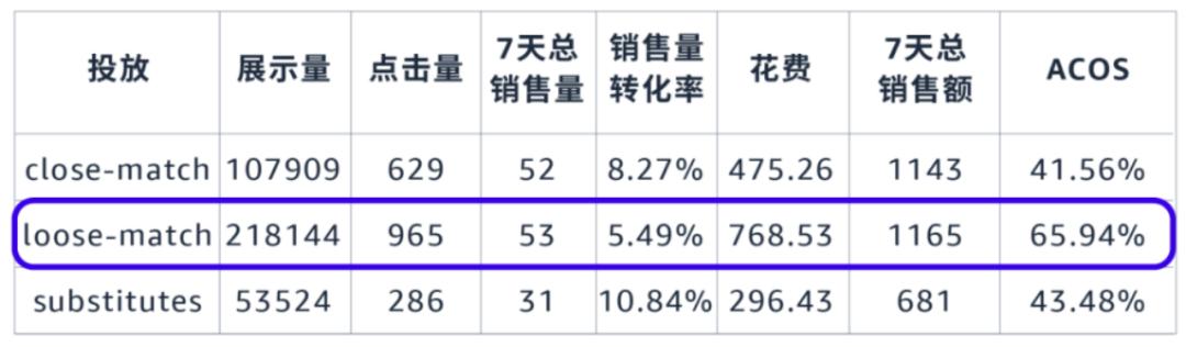 如下表,某个自动广告的宽泛匹配ACOS高于其他匹配方式。