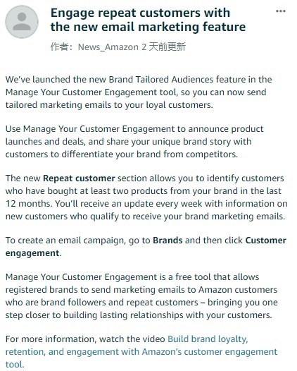 据了解,Manage Your Customer Engagement是一款免费工具,允许注册品牌向亚马逊客户发送营销电子邮件,这些客户是品牌追随者和回头客——该工具有利于让卖家与客户建立持久关系又近一步。