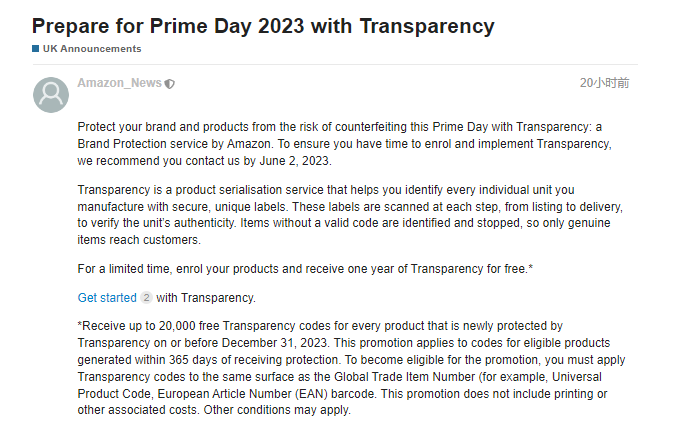 亚马逊表示,为确保卖家有时间注册和实施透明度计划,亚马逊建议在2023年6月2日之前联系平台。