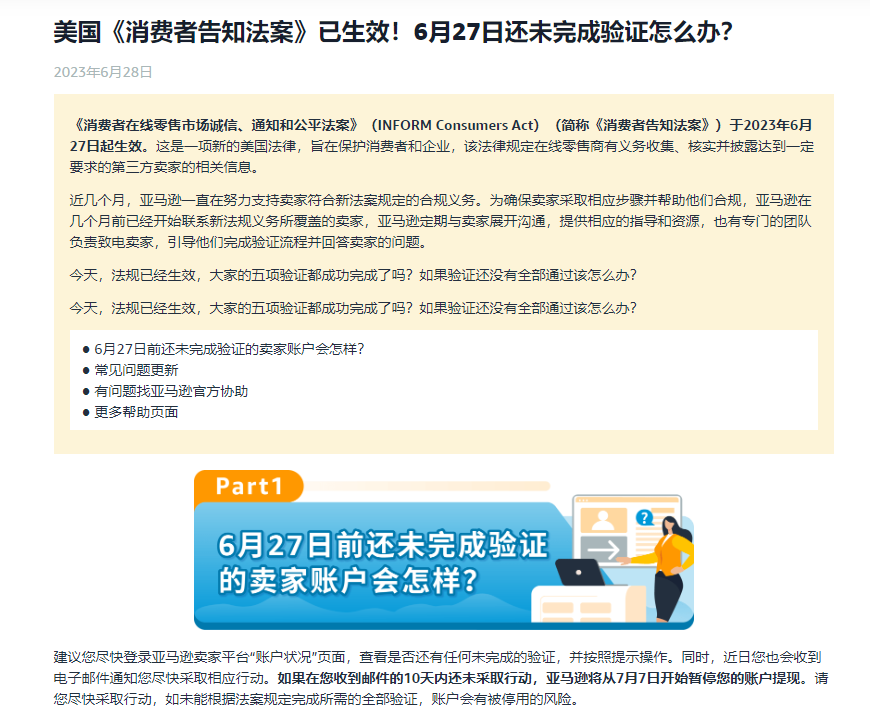 亚马逊在上个月向卖家发布了一封邮件,宣布从2023年7月7日起,将扣留未提供所需信息的卖家的资金,以满足美国国会通过的《消费者信息告知法案》的法律要求。据称,如果卖家在收到该邮件后的十天内未能提供所需信息,其亚马逊销售账户的款项将被冻结。