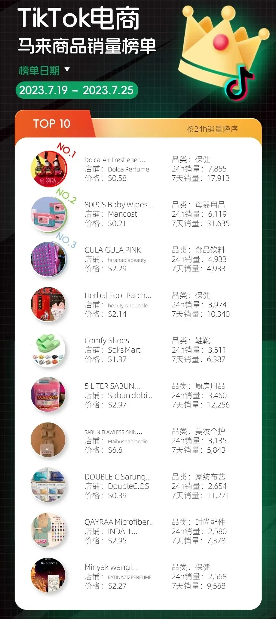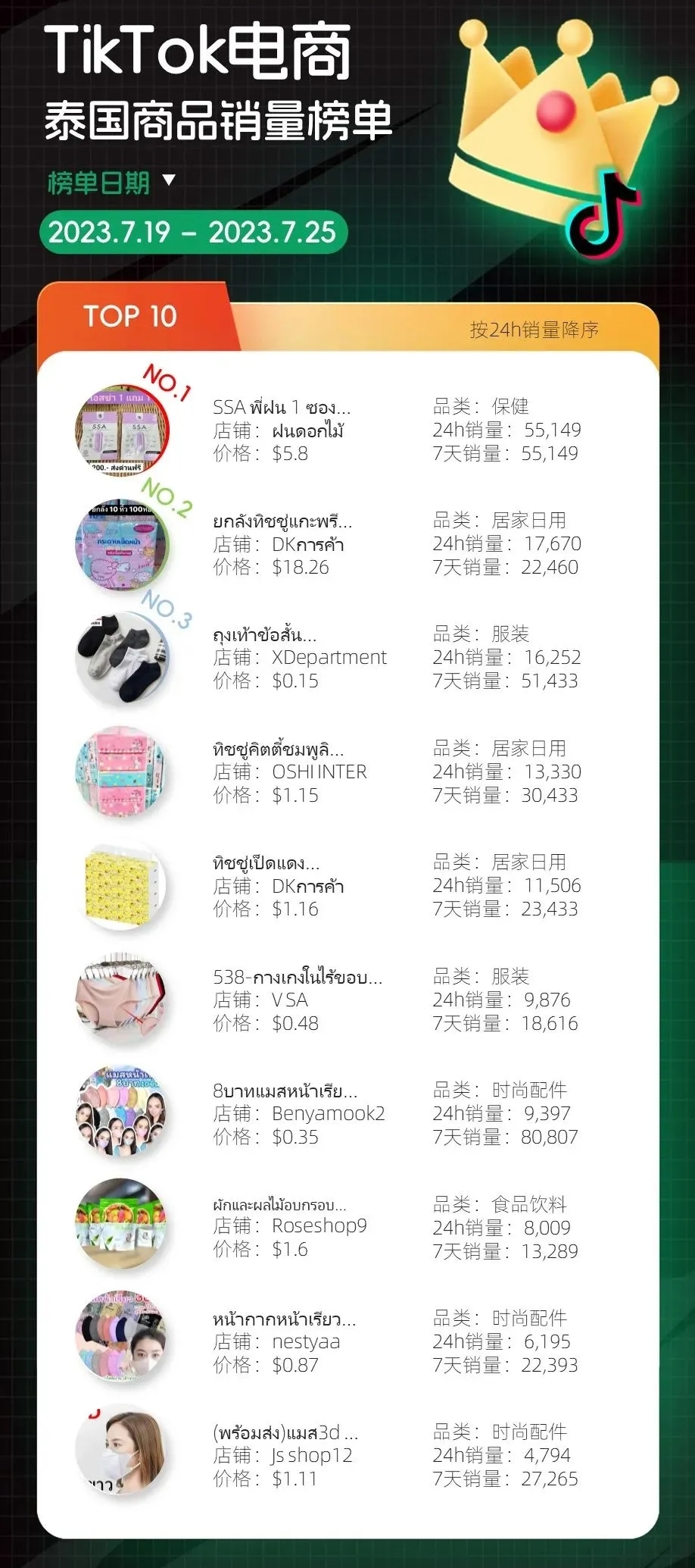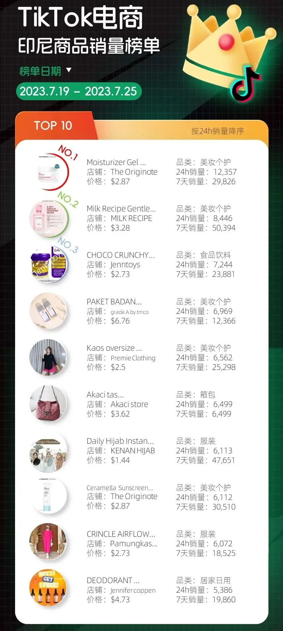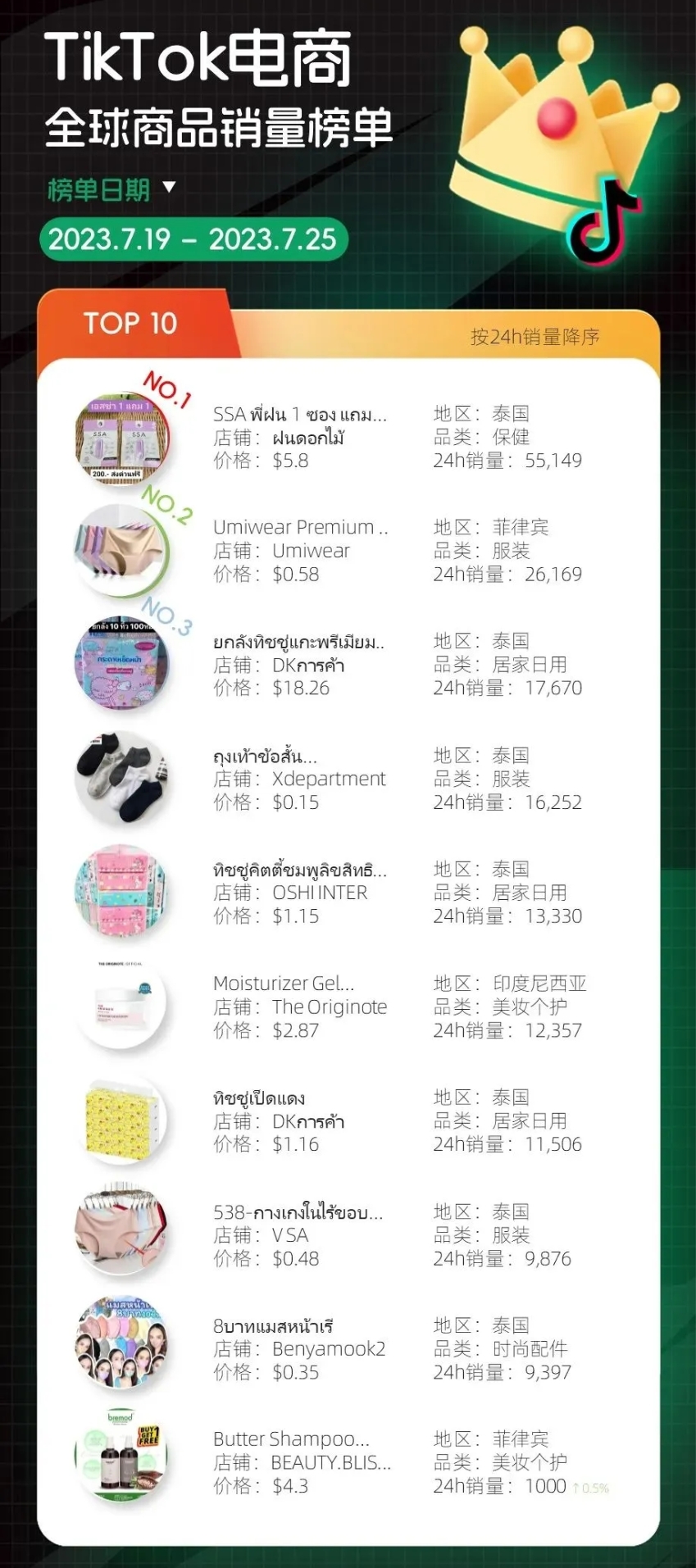 泰国、印尼和马来三国商品销量榜单