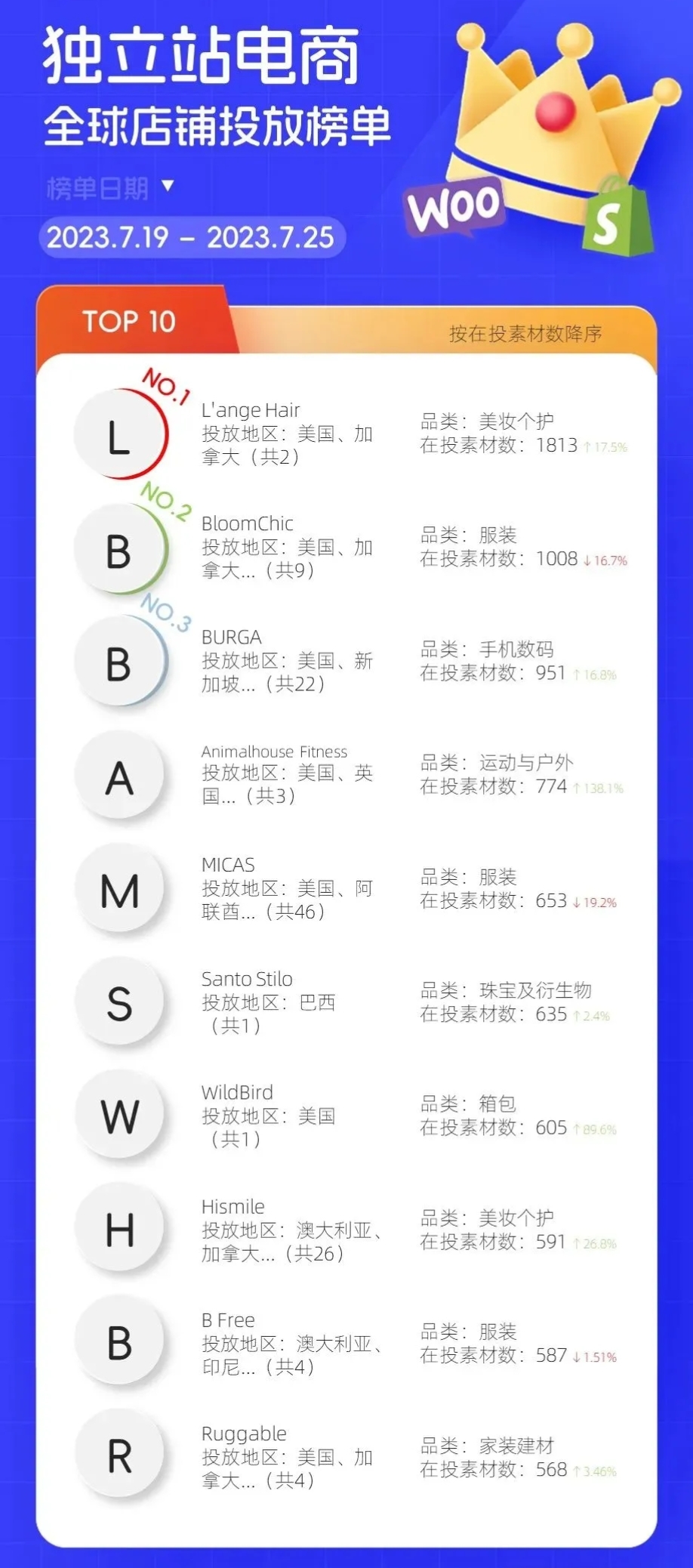 从全球独立站店铺投放榜来看,投放营销力度大的还是美妆和服装两大品类。排在TOP1的是美妆个护类品牌 L'ange Hair,该品牌主要提供多种类型和功能的烫发棒、直发器、吹风机、热刷等,可以满足不同的头发造型需求。排在TOP2的是女装大码品牌 Bloomchic,排在TOP3的是主要做手机壳、手机配件和设备保护套的品牌 Burga。