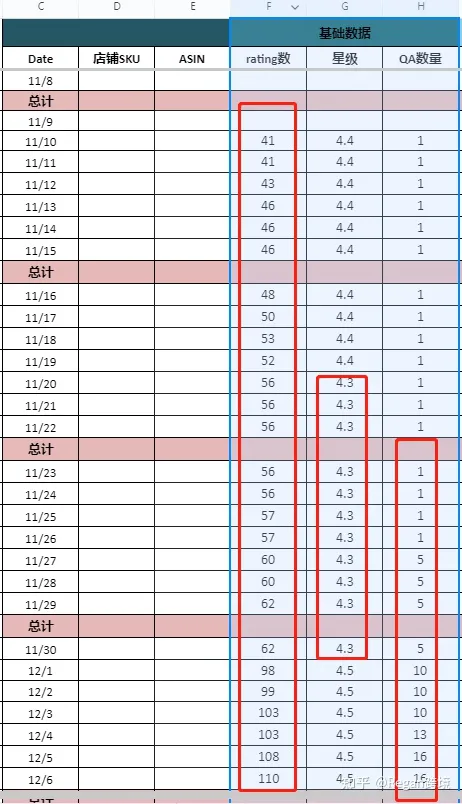 Rating数量:我们需要去关注每天评论变化,包括我们评论数量和星级都需要记录下来。这些数据可以直观地看到整个链接每天评论的数量是如何变化的。比如在某一个时间段之内,评论遭到了差评导致掉权重。