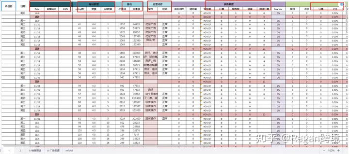 其次是跟进排名变化以及运营动作记录,链接小类排名以及大类排名在什么位置,排名波动大不大?以及我们在当天操作了哪些的运营动作,比如来了差评进行了测评安排,以及广告进行了优化。关于广告优化也有专门的表格来记录。这样广告的数据发生了变化可以来反推是具体人为操作原因还是市场原因导致的变化。