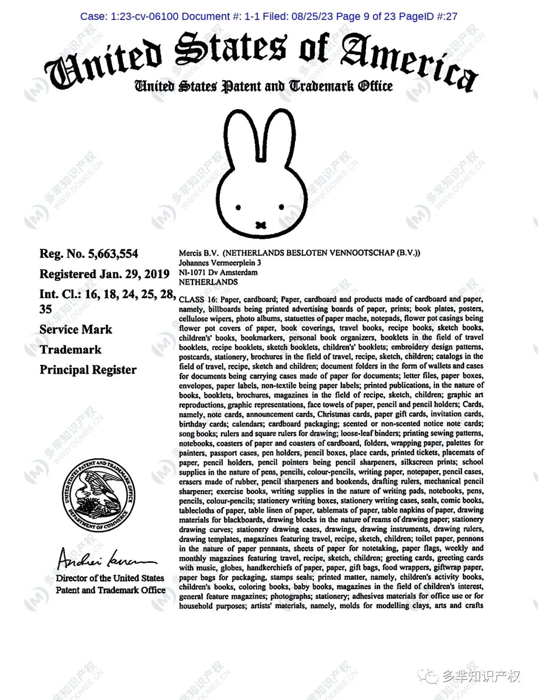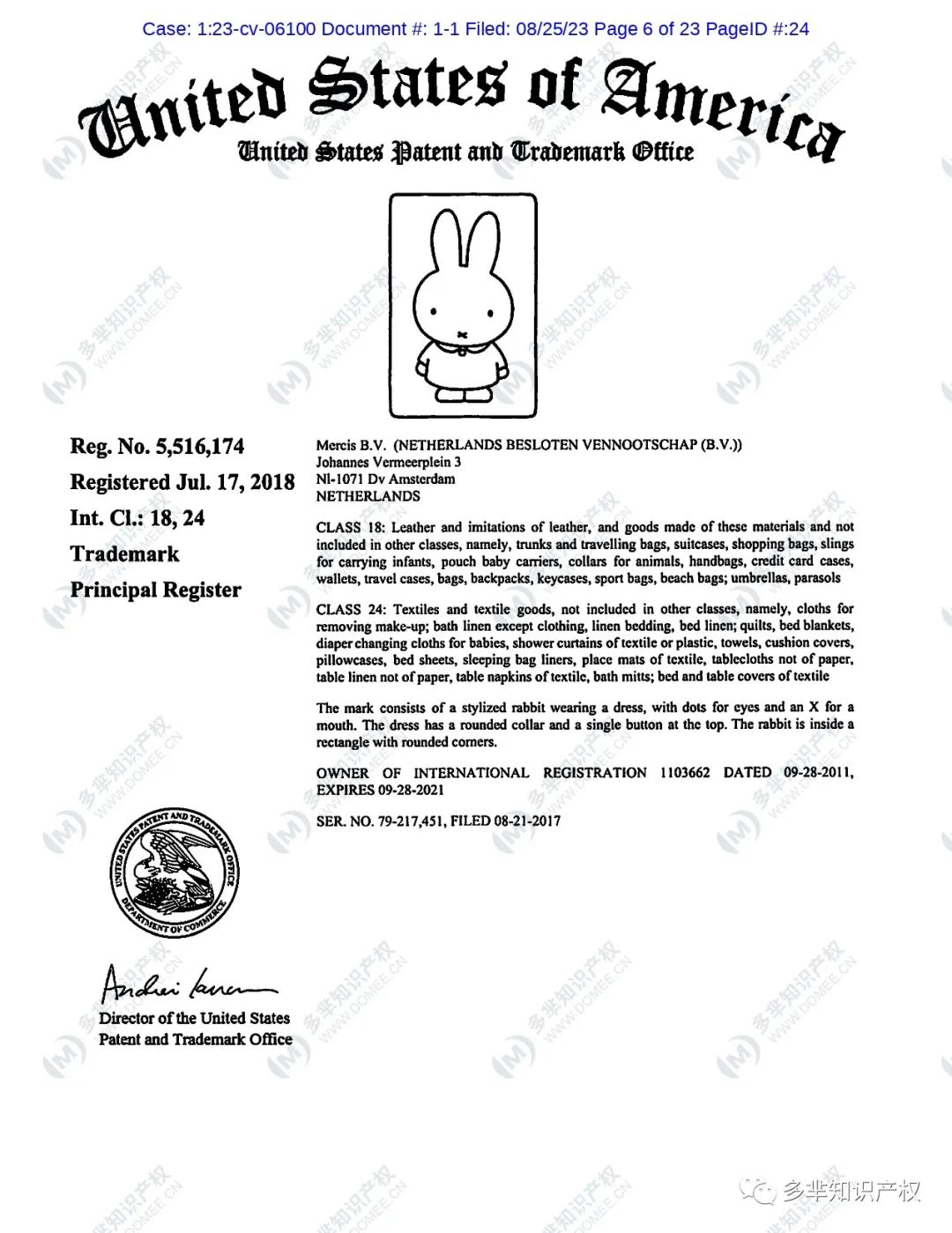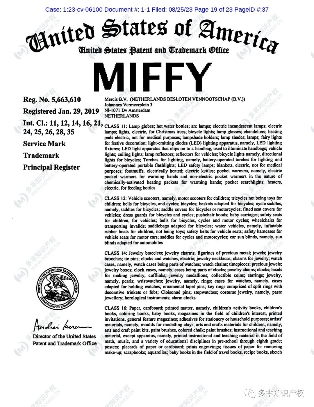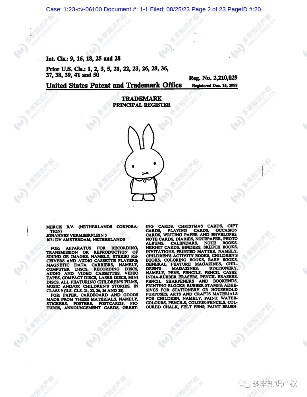 案件参数: 案件编号:2023-cv-06100 起诉时间:2023年8月25日 原告律所:HSP 原告方:Mercis B.V. 侵权原因:商标侵权 侵权关键词:MIFFY 注册商标: 本次举证的文字及图案商标共11个,注册在5、9、11、12、14、16、18、21、24、25、26、28、35等多个类目,涉及商品种类极多,保护范围广泛。据wipo全球品牌数据库搜索显示,Miffy在全球多个国家均注册了商标,不管在哪个国家售卖商品都需注意,避免侵权。 Miffy也是一个“危险”品牌,从2019年至今,Mercis B.V.共发起19起商标侵权案,被告多达1000+,注意及时自查,下架可能侵权的产品。 品牌介绍: MIFFY米菲兔,诞生于1955年,是世界上图画书作家之一的荷兰画家迪克·布鲁纳创作的经典动画人物。米菲是个令人着迷的小兔子,她简单、无邪、坚决,永远愿意接受新体验。以米菲家族故事来衍生出与之相关的服装、用品等商品,深受全世界各地小朋友的喜爱。 官方网站:https://miffyshop.co.uk/ 产品相关示例: 本案件主要涉及产品有照明器具、文具、儿童书籍、箱包、服装、玩具、体育用品和婴儿用品等,以下为部分产品销售示例。