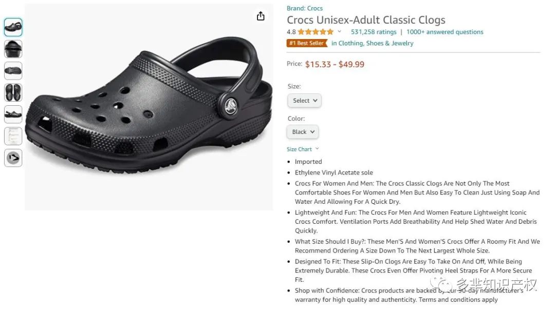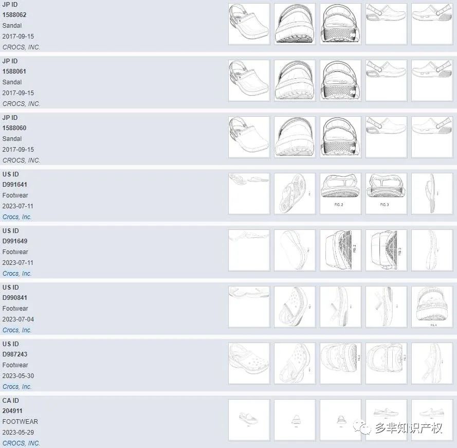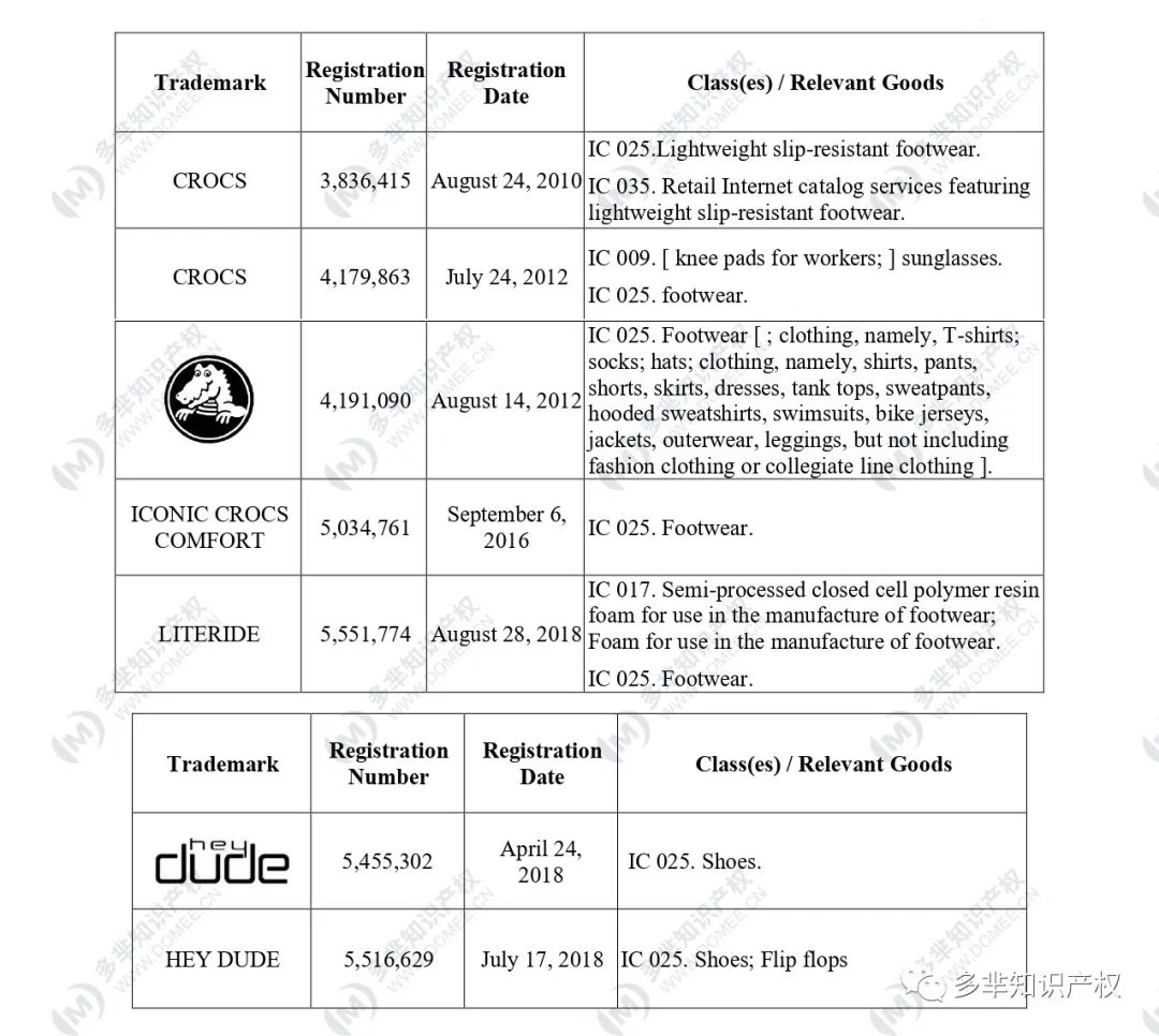 案件参数: 案件编号:2023-cv-61654 起诉时间:2023年8月28日 原告律所:STEPHEN M. GAFFIGAN, P.A. 原告方:Crocs, Inc 侵权原因:商标侵权 侵权关键词:Crocs;ICONIC CROCS COMFORT;LITERIDE;HEY DUDE等 注册商标: 本次举证的文字及图案商标共7个,注册在9、17、25、35类,主要涉及轻便防滑鞋、鞋类和太阳镜等,曾起诉上百家店铺。 除了商标,Crocs还注册了许多专利,虽近两年未起诉专利侵权,但建议同时规避。 品牌介绍: Crocs(卡骆驰)是一家总部位于美国科罗拉多州的鞋履设计、生产及零售商,是全球领先的创新型休闲鞋制造商,为女士、男士和儿童提供产品。创立于2002年,Crocs鞋子最初的产品市场定位是帆船运动和户外运动者,后来因为它穿着舒适而受到不同消费者的青睐。 官方网站:https://www.crocs.com/ 产品相关示例: 本案主要涉及产品有轻便防滑鞋、鞋类和太阳镜等,以下为部分产品销售示例。