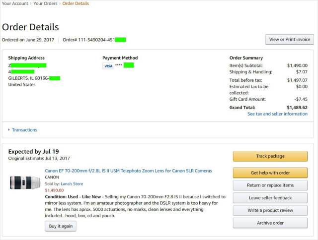 本人6月29日在亚马逊以一个很好的价格买了一个二手佳能70-200mm f/2.8 II镜头,这个卖家只有一个good review,似乎没有卖过其他产品,应该是个专门卖二手货的。