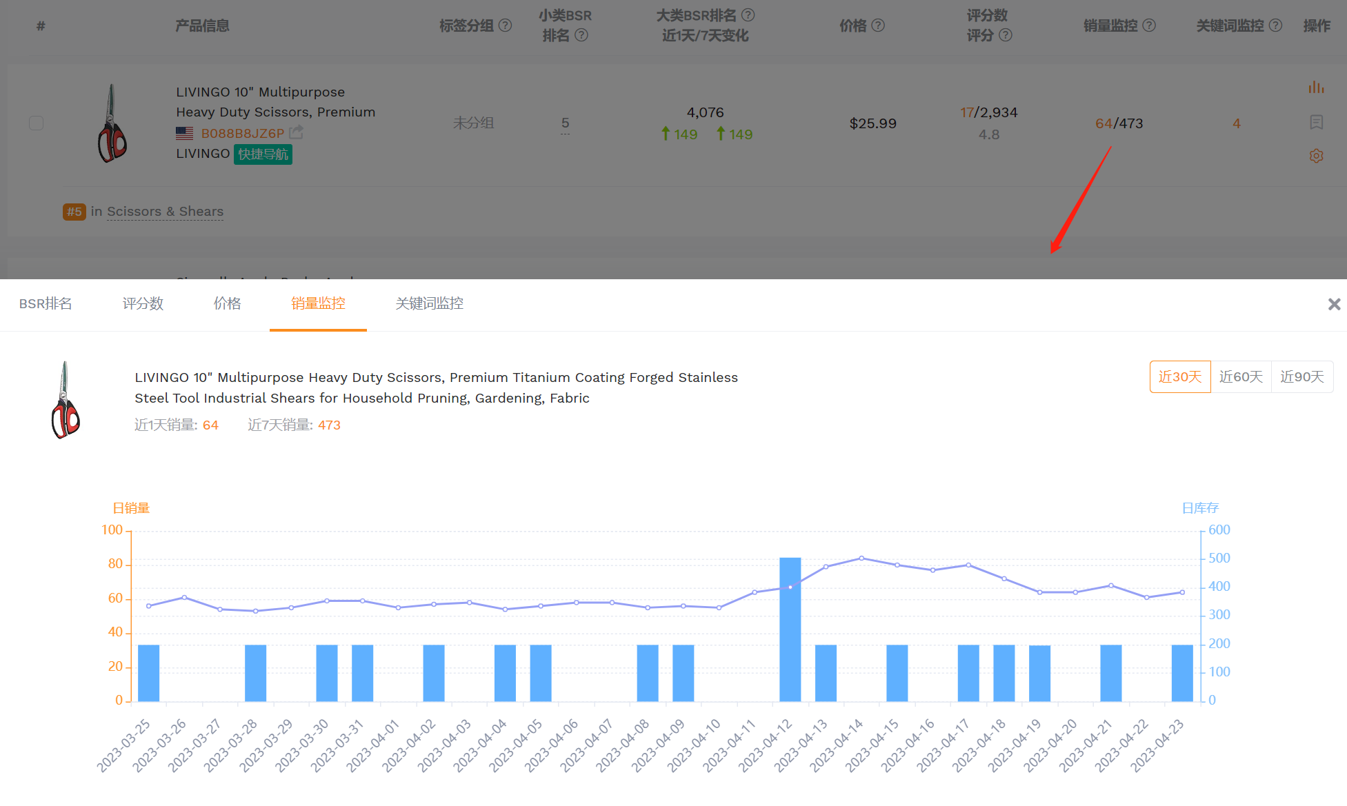 5、点击销量监控对应数字就可以看到该ASIN近30天/近60天/近90天的日库存和日销量变化趋势。
