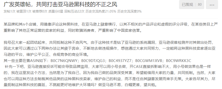 但对于老老实实做白帽运营的卖家来说,这种操作肯定是不公平的,甚至可以说损害了大多数卖家的利益。目前已经有卖家在论坛发起号召共同抵制。