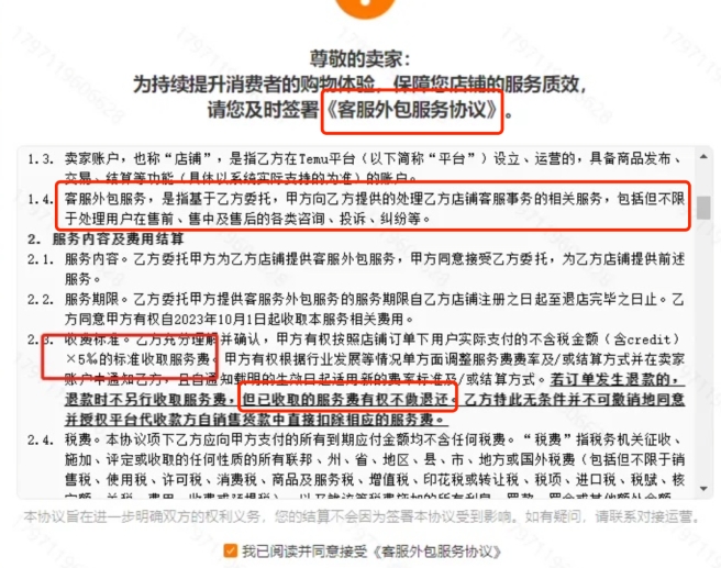 AMZ123获悉,有卖家于昨日发现Temu出台了一个新协议:《客服外包服务协议》。该协议内容透露出一个信号,即Temu开始向卖家们收取相应佣金,其内容显示:甲方有权按照店铺订单下用户实际支付的不含税金额(含credit)× 5‰ 的标准收取服务费。甲方有权根据行业发展等情况单方面调控服务费费率及/或结算方式并在卖家账户中通知乙方,且自通知载明的生效日起适用新的费率标准及/或结算方式。若订单发生退款的,退款时不另行收取服务费,但已收取的服务费有权不做退还。乙方特此无条件并不可撤销地同意并授权平台代收款方自销售货款中直接扣除相应的服务费。