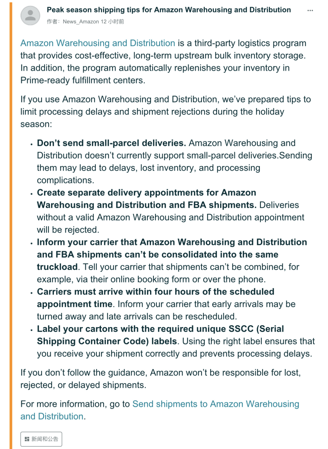 亚马逊美国站发布公告称,对将在旺季使用亚马逊入仓分销网络(AWD)补货的卖家给出几点建议,以帮助卖家在假日旺季高峰期间减少处理延迟和货件拒绝的情况。