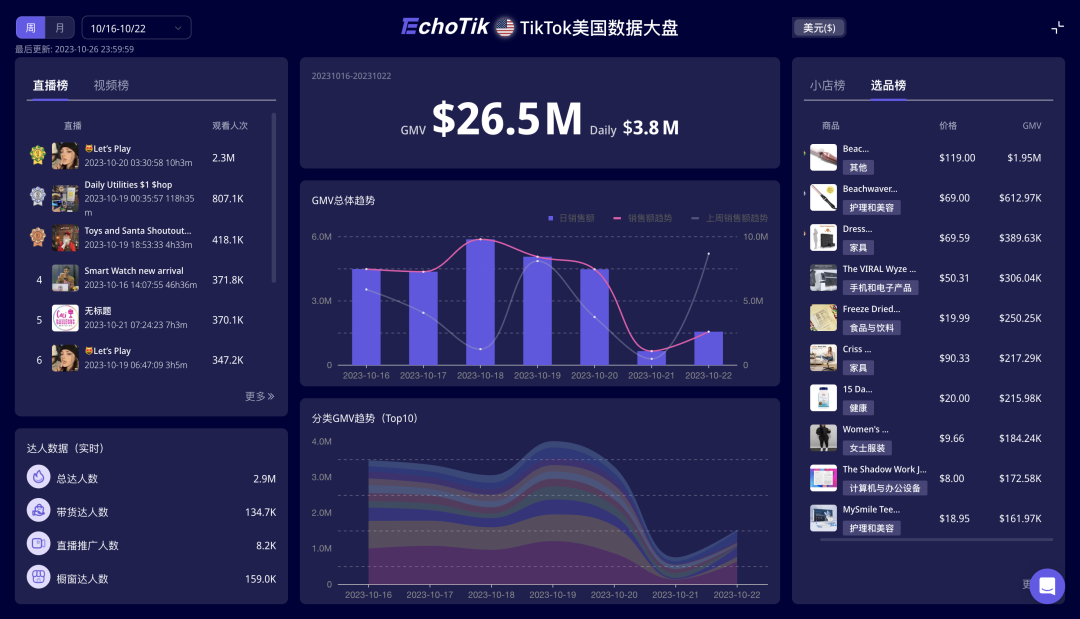 TikTok Shop美国电商数据周榜(10/16-22)已出,具体信息如下: