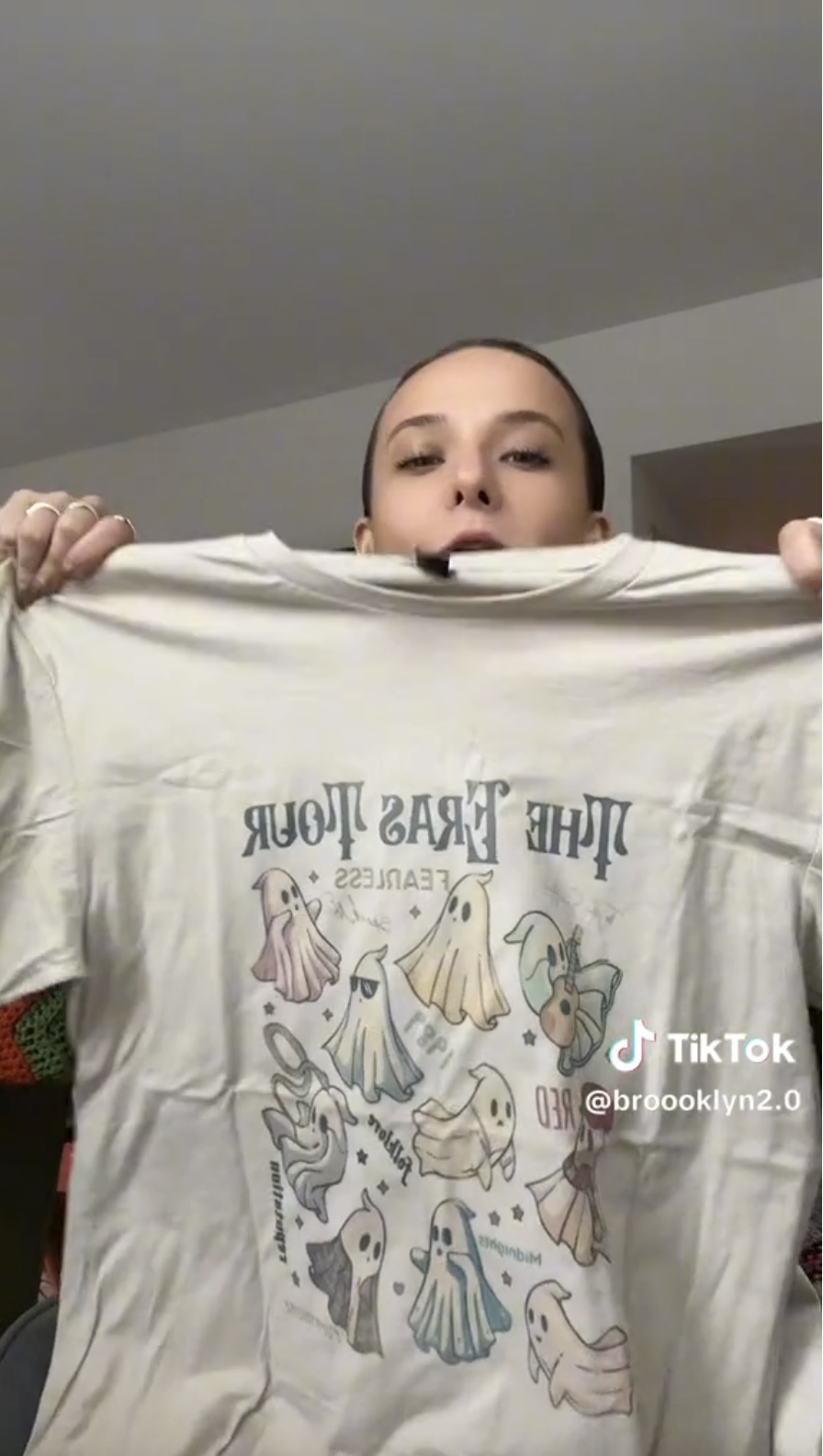 博主 @brooklyn2.0 在发布这条T恤带货视频时,同时添加了女明星#TaylorSwift、演唱会#ErasTour 的标签和万圣节的节日标签,来放大曝光度,也取得了不错的销售转化。