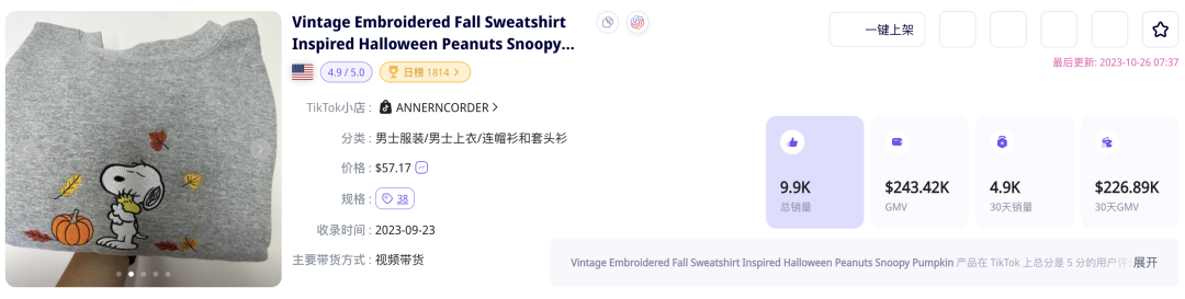 史努比万圣节主题卫衣也通过低成本的大量短视频取得了高流量和高转化,总计售出了近1万件卫衣,GMV达到24.34万美元。由此可见,时刻关注外网流行话题,培养网感可以有效助推品牌及商品成功出海。