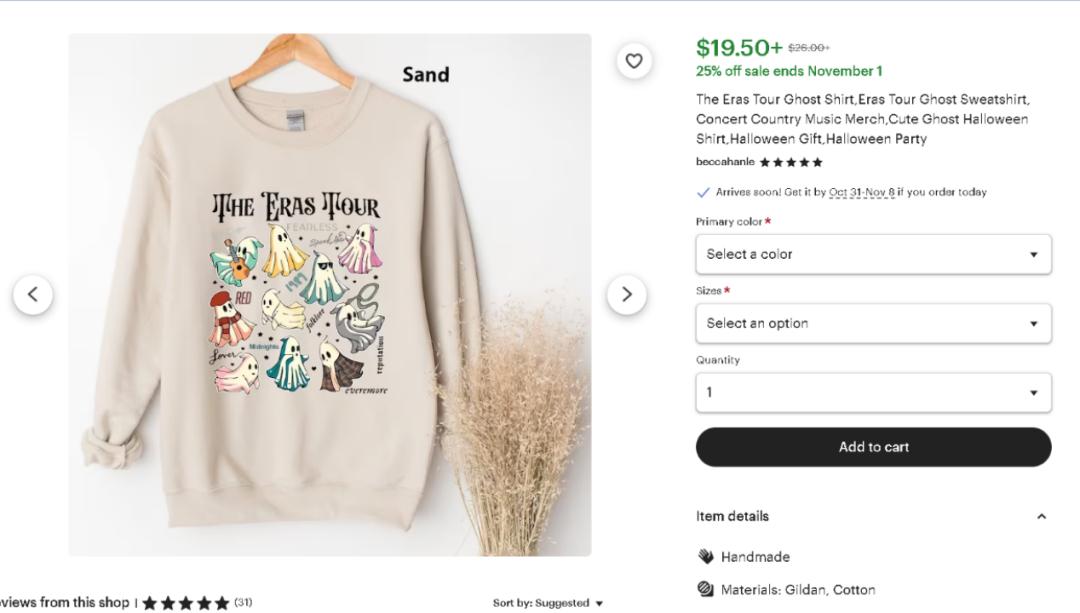 近日,全球顶流女星泰勒·斯威夫特的时代巡回演唱会正风靡欧美,而这件卫衣正是将万圣节和泰勒的设计元素融合,将泰勒不同时期的形象萌化为一个个小幽灵,作为印花图案,向粉丝们销售。