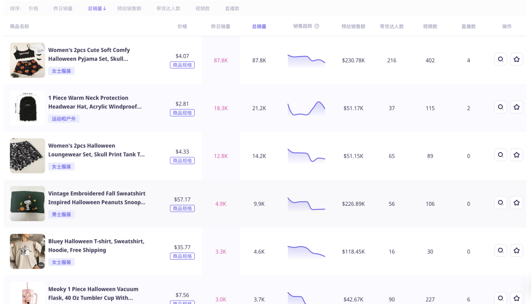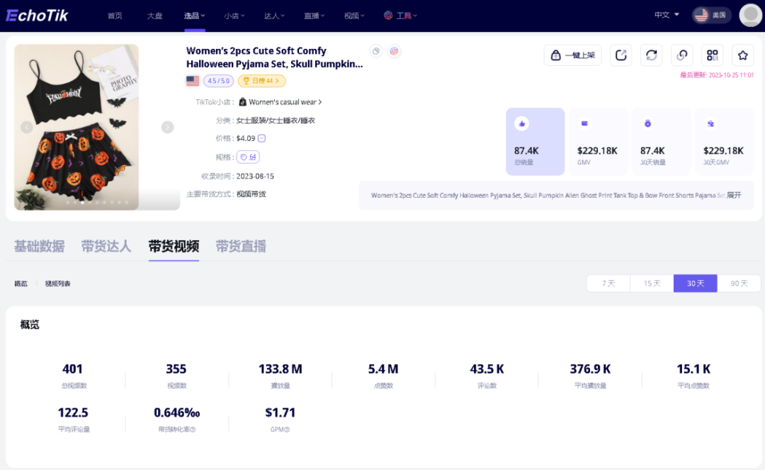 服装类目在TikTok Shop全球各地区始终是最热门的稳居GMV Top 3热门类目,这件女士睡衣是万圣节热销商品Top 1,单价4.09美元,30天销量达到8.74万件,主要靠大量合作达人的视频带货,总播放量高达1.3亿。