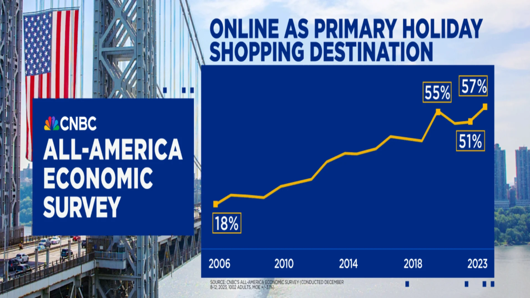 CNBC指出,在2006年,将网上购物作为首选目的地的人数比例仅为18%。在2020年疫情爆发时期,这一比例达到了55%的历史最高水平。2022年,这一比例降至51%。而今年,这一比例再次创下了新高。